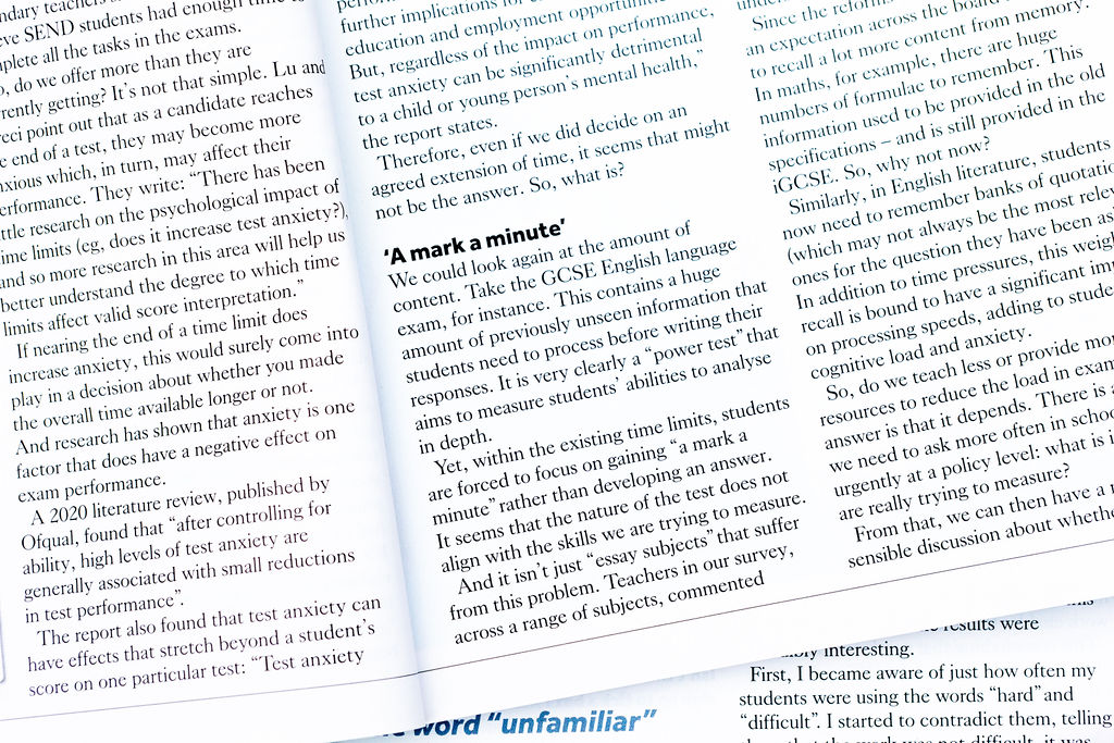 Following the exam hiatus caused by the Covid-19 pandemic, my husband Martin Noon and I were approached by the editor of TES to undertake a 4-page research article about whether students undertaking exams under timed conditions was a fair and accurate way to test them. We followed this up with an interview on the TES podcast.