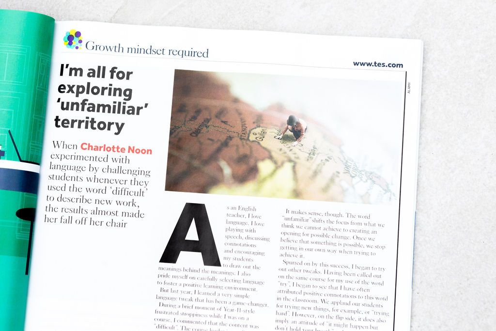 I was commissioned to write a piece based on my own experience of how minor language tweaks in the classroom have delivered big results in terms of growth mindset. Changing the word "difficult" to "unfamiliar", for example, can completely change a student's attitude to attempting a task and the word "try" speaks volumes in terms of the self-doubt a student may be feeling.